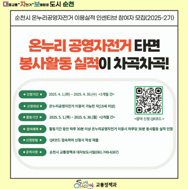[NWS¹æ¼Û=Çѽ¸ñ ±âÀÚ]¼øÃµ½Ã´Â ½Ã¹ÎµéÀÇ ÀÏ»ó ¼Ó ÀÚÀü°Å ÀÌ¿ëÀ» Àå·ÁÇϰíÀÚ ¡®¿Â´©¸® °ø¿µÀÚÀü°Å ºÀ»çȰµ¿ ÀÎÁõ ÇÁ·Î±×·¥¡¯ 2±â Âü¿©ÀÚ¸¦ ¸ðÁýÇÑ´Ù°í ¹àÇû´Ù. ÀÌ ÇÁ·Î±×·¥Àº ÇÏ·ç 30ºÐ ÀÌ»ó ÀÚÀü°Å¸¦ ÀÌ¿ëÇÏ¸é ºÀ»çȰµ¿ ½Ã°£ 30ºÐÀÌ ÀΡ¦