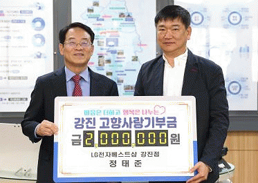 [NWS¹æ¼Û=Çѽ¸ñ ±âÀÚ]À±¿µÃ¶ ¢ß´öÀξàǰ ´ëÇ¥¿Í Á¤ÅÂÁØ LGÀüÀÚº£½ºÆ®¼¥ °­ÁøÁ¡ Á¤Á¾ÈÆ ´ëÇ¥ÀÇ ¾ÆµéÀÌ Ãá»ç¿ùÀÇ µû¶æÇÑ ¸¶À½À» ´ã¾Æ °­Áø °íÇâ»ç¶û±âºÎ±Ý °¢ 1¹é¸¸ ¿ø, 2¹é¸¸ ¿øÀ» ±âŹÇß´Ù. À±¿µÃ¶ ´ëÇ¥´Â ¡°±âºÎ±ÝÀ¸·Î ÁÁÀº º¹Áö »ç¾÷¡¦