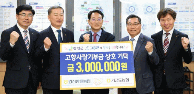 [NWS¹æ¼Û=Çѽ¸ñ ±âÀÚ]°­Áø±ºÀº Áö³­ 14ÀÏ °­ÁøÇѵé³óÇù°ú °íÈï°Å±Ýµµ³óÇù ÀÓÁ÷¿øµéÀÌ °­Áø±ºÃ»À» ã¾Æ °íÇâ»ç¶û±âºÎ±Ý 300¸¸¿øÀ» »óÈ£ Áö¿ª¿¡ ±âºÎÇß´Ù°í 15ÀÏ ¹àÇû´Ù. °­Áø±ºÃ»¿¡¼­ ÁøÇàµÈ ±âºÎ½Ä¿¡´Â °­Áø¿ø °­Áø±º¼ö, À念Á¶ ³óÇùÁß¡¦