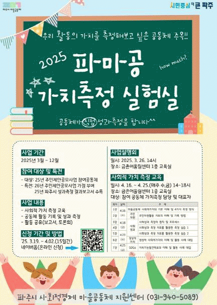 [NWS¹æ¼Û=Çѽ¸ñ ±âÀÚ]ÆÄÁֽô ¸¶À»°øµ¿Ã¼ Ȱµ¿ÀÇ »çȸÀû °¡Ä¡¸¦ ÃøÁ¤ÇÏ´Â ¡®2025 ÆÄ¸¶°ø °¡Ä¡ ÃøÁ¤ ½ÇÇè½Ç¡¯ »ç¾÷À» ÃßÁøÇÑ´Ù°í ¹àÇû´Ù. ÀÌ ½ÇÇèÀº ¸¶À»°øµ¿Ã¼ÀÇ È°µ¿ÀÌ Áö¿ª»çȸ¿¡ ¹ÌÄ¡´Â ¿µÇâÀ» ±¸Ã¼ÀûÀ¸·Î ¹àÈ÷°í, ±× ¼º°ú¸¦ °¡½ÃÀû¡¦