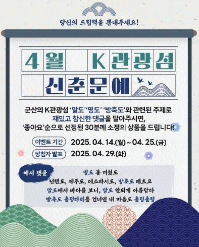 [»çȸ] ±º»ê K-°ü±¤¼¶ 4¿ù ½ÅÃá¹®¿¹ ¿Â¶óÀÎ(SNS) À̺¥Æ® °³ÃÖ ¡®´ç½ÅÀÇ µå¸³·Â¡¯À» º¸¿©ÁÖ¼¼¿ä! |2025. 04.15