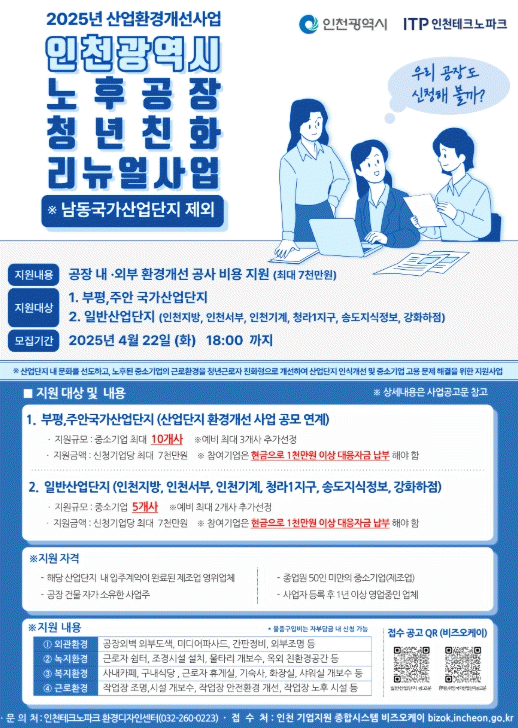 [NWS¹æ¼Û=ÇãÀº¼­ ±âÀÚ]ÀÎõÅ×Å©³ëÆÄÅ©(ÀÎõTP)´Â »ê¾÷´ÜÁö ³» ³ëÈÄ °øÀåÀ» û³â ģȭÇü ±Ù¹«È¯°æÀ¸·Î Å»¹Ù²ÞÇÏ´Â ¡®³ëÈİøÀå û³âģȭ ¸®´º¾ó¡¯ »ç¾÷À» ÃßÁøÇϸç, ¿À´Â 4¿ù 22ÀϱîÁö Âü¿© ±â¾÷À» ¸ðÁýÇÑ´Ù. ÀÌ »ç¾÷Àº ³ëÈÄÈ­µÈ »ê¾÷´ÜÁö¡¦