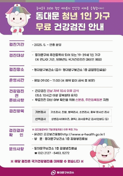 [»çȸ] µ¿´ë¹®±¸, 5¿ùºÎÅÍ 'û³â 1Àΰ¡±¸ ¹«·á °Ç°­°ËÁø' ù ½ÃÇà |2025. 04.15