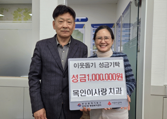 [NWS¹æ¼Û=Çѽ¸ñ ±âÀÚ]ºÎ»ê ºÏ±¸ ¸¸´ö1µ¿¿¡ À§Ä¡ÇÑ ¸ñÀÎÀÌ»ç¶û Ä¡°ú°¡ Áö¿ª»çȸ¿¡ µû¶æÇÑ ³ª´®À» ½ÇõÇϸç ÁÖ¸ñ¹Þ°í ÀÖ´Ù. ¸ñÀÎÀÌ»ç¶û Ä¡°ú´Â Áö³­ 11ÀÏ, Àú¼ÒµæÃþ ÁֹεéÀ» µ½±â À§ÇØ ÀÌ¿ô¾Ö(äñ)¼º±Ý 100¸¸ ¿øÀ» ¸¸´ö1µ¿ ÇàÁ¤º¹Áö¼¾ÅÍ¡¦