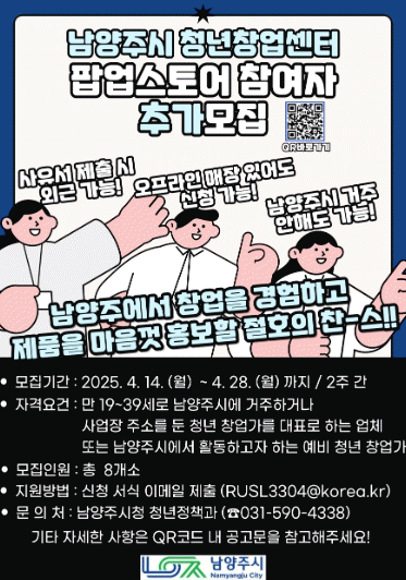 [°æÁ¦] ³²¾çÁÖ½Ã, û³ââ¾÷¼¾ÅÍ ÆË¾÷½ºÅä¾î Âü¿© »ç¾÷ÀÚ 4¿ù 28ÀϱîÁö Ãß°¡ ¸ðÁý |2025. 04.14