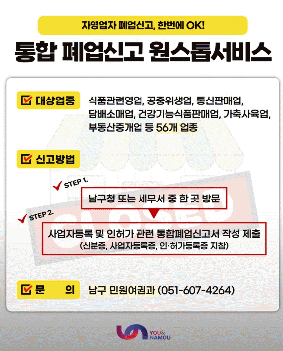 [»çȸ] ºÎ»ê ³²±¸, ÀÚ¿µ¾÷ÀÚ Æó¾÷ ½Å°í Çѹø¿¡ OK, ÅëÇÕ Æó¾÷ ½Å°í ¿ø½ºÅé ¼­ºñ½º ¿î¿µ |2025. 04.14