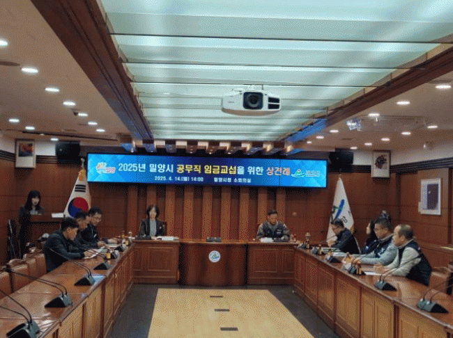 [NWS¹æ¼Û=Çѽ¸ñ ±âÀÚ]¹Ð¾ç½Ã´Â 14ÀÏ ½Ãû ¼ÒȸÀǽǿ¡¼­ ¹Ð¾ç½Ã °ø¹«Á÷ ³ëµ¿Á¶ÇÕ°ú 2025³âµµ ÀÓ±ÝÇù»óÀ» À§ÇÑ »ó°ß·Ê¸¦ °³ÃÖÇÏ¸ç º»°ÝÀûÀÎ ±³¼·¿¡ µé¾î°¬´Ù°í ¹àÇû´Ù. À̹ø »ó°ß·Ê´Â 2025³âµµ ¹Ð¾ç½Ã °ø¹«Á÷ ³ëÁ¶¿Í °øÁ¤Çϰí ÇÕ¸®ÀûÀÎ ÀÓ¡¦
