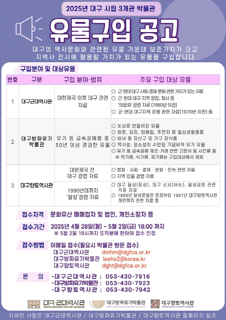 [NWS¹æ¼Û=Çѽ¸ñ ±âÀÚ] (Àç)´ë±¸¹®È­¿¹¼úÁøÈï¿ø ¹Ú¹°°ü¿î¿µº»ºÎ ¼Ò¼Ó ´ë±¸±Ù´ë¿ª»ç°ü¡¤´ë±¸¹æÂ¥À¯±â¹Ú¹°°ü¡¤´ë±¸ÇâÅ俪»ç°ü¿¡¼­´Â ´ë±¸ Áö¿ª»ç ¹× ÀüÅë°ø¿¹ °ü·Ã Áß¿ä À¯¹°À» ±¸ÀÔÇØ Àü½Ã ¹× Çмú¿¬±¸¡¤±³À°ÀÚ·á·Î ³Î¸® Ȱ¿ëÇϱâ À§ÇØ À¯¡¦
