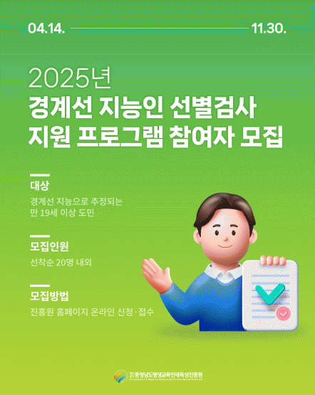 [»çȸ] (Àç)ÃæÃ»³²µµÆò»ý±³À°ÀÎÀçÀ°¼ºÁøÈï¿ø, °æ°è¼± Áö´ÉÀÎ ¼±º°°Ë»ç Áö¿ø ÇÁ·Î±×·¥ Âü¿©ÀÚ ¸ðÁý |2025. 04.14