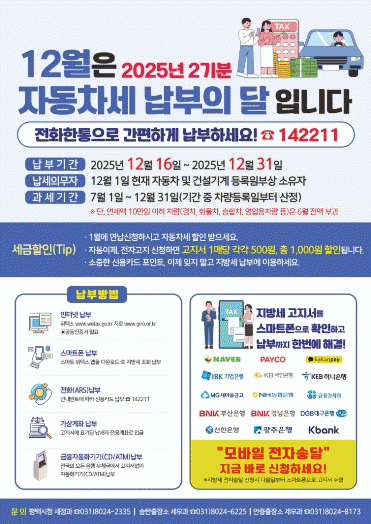 [NWS¹æ¼Û=Çѽ¸ñ ±âÀÚ]ÆòÅýô 2025³â 12¿ù Á¤±âºÐ ÀÚµ¿Â÷¼¼ 16¸¸ 5õ °Ç¿¡ ´ëÇØ 199¾ï ¿øÀ» ºÎ°ú¡¤°íÁöÇÏ°í ³³ºÎ ±âÇÑ ³» ³³ºÎÇϵµ·Ï Àû±ØÀûÀÎ È«º¸¿¡ ³ª¼¹´Ù°í ¹àÇû´Ù. ÀÚµ¿Â÷¼¼´Â ¿¬ 2ȸ(6¿ù, 12¿ù) ºÎ°úÇÏ´Â Á¤±âºÐ ¼¼¸ñÀ¸·Î, À̹ø¡¦
