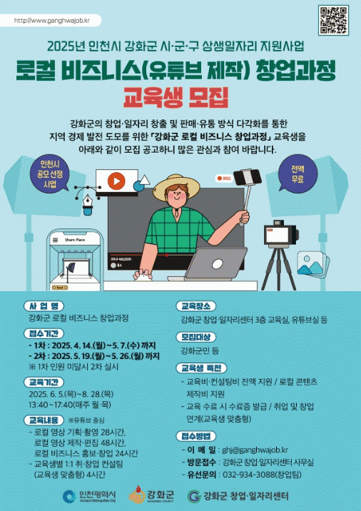 [NWS¹æ¼Û=ÇãÀº¼­ ±âÀÚ]°­È­±º â¾÷¡¤ÀÏÀÚ¸®¼¾ÅͰ¡ ¿À´Â 5¿ù 7ÀϱîÁö ¡®°­È­±º ·ÎÄà ºñÁî´Ï½º â¾÷ °úÁ¤¡¯ ±³À°»ýÀ» ¸ðÁýÇÑ´Ù. °­È­±º ·ÎÄà ºñÁî´Ï½º â¾÷ °úÁ¤Àº ÀÎõ½Ã¿¡¼­ ÁÖ°üÇÏ´Â 2025³â ½Ã-±º¡¤±¸ »ó»ý ÀÏÀÚ¸® Áö¿ø»ç¾÷¿¡ ¼±Á¤µÅ »ç¡¦