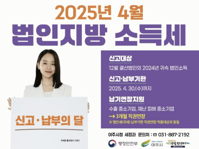 [NWS¹æ¼Û=Çѽ¸ñ ±âÀÚ]¿©Áֽô 2025³âµµ 4¿ù ÇÑ ´Þ°£ ¹ýÀÎÁö¹æ¼Òµæ¼¼ ÁýÁß ½Å°í¡¤³³ºÎÀÇ ´ÞÀ» ¿î¿µÇÑ´Ù. ½Å°í´ë»óÀº 2024³â 12¿ù °á»ê¹ýÀÎÀ¸·Î ¿µ¸®¹ýÀÎ, ¼öÀÍ»ç¾÷À» ¿µÀ§ÇÏ´Â ºñ¿µ¸®¹ýÀÎ, ±¹³»¿øÃµ¼ÒµæÀÌ ÀÖ´Â ¿Ü±¹¹ýÀÎ µîÀ̸ç, 4¿ù 3¡¦