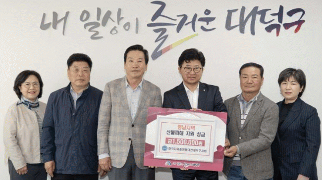 [NWS¹æ¼Û=Çѽ¸ñ ±âÀÚ]´ëÀü ´ë´ö±¸´Â Çѱ¹ÀÚÀ¯ÃÑ¿¬¸Í´ëÀü±¤¿ª½Ã´ë´ö±¸Áöȸ·ÎºÎÅÍ ¿µ³²Áö¿ª »êºÒ ÇÇÇØ ÁֹΠÁö¿øÀ» À§ÇÑ ¼º±Ý 150¸¸¿øÀ» Àü´Þ¹Þ¾Ò´Ù°í 14ÀÏ ¹àÇû´Ù. Çѱ¹ÀÚÀ¯ÃÑ¿¬¸Í´ëÀü±¤¿ª½Ã´ë´ö±¸Áöȸ ȸ¿øµéÀÌ ÀÚ¹ßÀûÀ¸·Î ¶æÀ» ¸ð¾Æ ¸¶¡¦