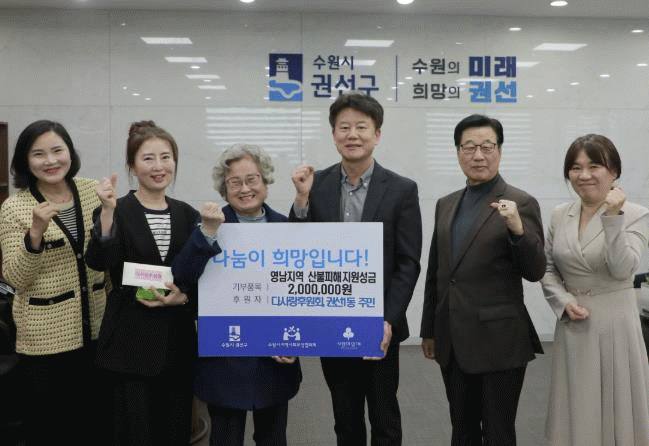 [NWS¹æ¼Û=Çѽ¸ñ ±âÀÚ]¼ö¿ø½Ã ±Ç¼±±¸´Â Áö³­ 11ÀÏ, ´Ù»ç¶ûÈÄ¿øÈ¸ ¹× ±Ç¼±1µ¿À¸·ÎºÎÅÍ ¿µ³²Áö¿ª »êºÒÇÇÇØ Áö¿ø ¼º±ÝÀ» Àü´Þ¹Þ¾Ò´Ù. ÇØ´ç ¼º±ÝÀº ´Ù»ç¶ûÈÄ¿øÈ¸ÀÇ ÁÖ°üÀ¸·Î ȸ¿ø Àϵ¿ ¹× ±Ç¼±1µ¿ ÁֹΠ20¿© ¸íÀÌ ½Ê½ÃÀÏ¹Ý ¸ð¾Æ ¸¶·ÃµÆ´Ù. ÃÑ¡¦