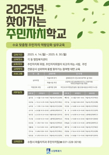 [NWS¹æ¼Û=Çѽ¸ñ ±âÀÚ]¼ö¿ø½Ã°¡ 6¿ù 30ÀϱîÁö ¡®2025³â ã¾Æ°¡´Â ÁÖ¹ÎÀÚÄ¡Çб³¡¯¸¦ ¿î¿µÇØ ÁÖ¹ÎÀÚÄ¡ À§¿ø°ú ÁֹεéÀÇ ½Ç¹«¿ª·® °­È­¿¡ ³ª¼±´Ù. ±³À°Àº °¢ µ¿ ÇàÁ¤º¹Áö¼¾ÅÍ¿¡¼­ ¿­¸°´Ù. ÁÖ¹ÎÀÚġȸ À§¿ø, ÁÖ¹ÎÀÚÄ¡ À§¿øÀÌ µÇ°íÀÚ ÇÏ´Â ÁÖ¡¦