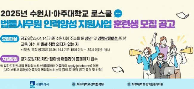 [»çȸ] ¼ö¿ø½Ã¡¤¾ÆÁÖ´ëÇб³ ·Î½ºÄð ¹ý·ü»ç¹«¿ø Àη¾缺 Áö¿ø»ç¾÷ ±³À°ÈƷûý ¸ðÁý |2025. 04.14