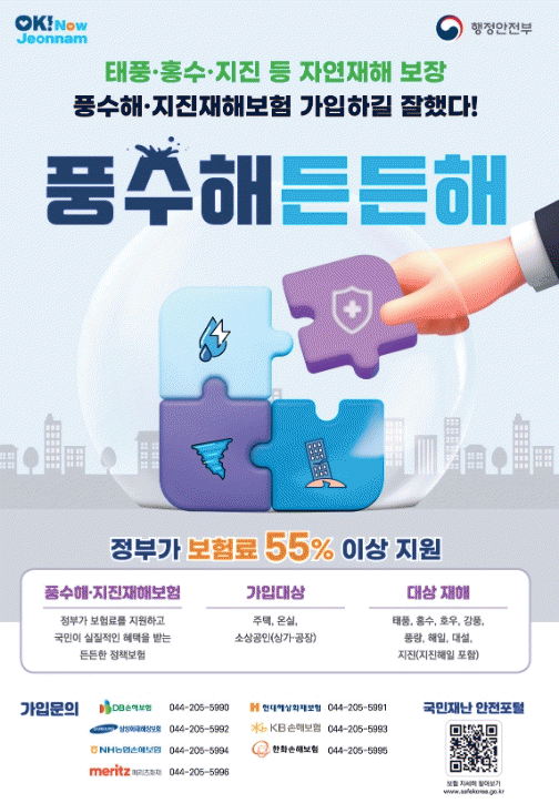 [NWS¹æ¼Û=Çѽ¸ñ ±âÀÚ]Àü¶ó³²µµ°¡ ÀÚ¿¬ÀçÇØ ¹ß»ý ½Ã º¸»óÀ» ¹ÞÀ» ¼ö Àִ dz¼öÇØ¡¤ÁöÁøÀçÇØº¸Çè °¡ÀÔ È«º¸¿¡ Àû±Ø ³ª¼¹´Ù. dz¼öÇØ¡¤ÁöÁøÀçÇØº¸ÇèÀº ÅÂdz, È«¼ö, È£¿ì, °­Ç³, dz¶û, ÇØÀÏ, ´ë¼³, ÁöÁø µî ÀÚ¿¬Àç³­À¸·Î ¹ß»ýÇÑ ÇÇÇØ¸¦ ½ÇÁú¡¦