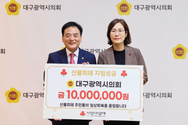 [NWS¹æ¼Û=Çѽ¸ñ ±âÀÚ]´ë±¸±¤¿ª½ÃÀÇȸ´Â ¿µ³²Áö¿ª »êºÒÇÇÇØ Áö¿ª º¹±¸ ¹× ÀÌÀç¹Î Áö¿øÀ» À§ÇØ ´ë±¸½ÃÀÇ¿ø°ú Á÷¿øµéÀÌ ÀÚÀ²ÀûÀ¸·Î ¸ð±ÝÇÑ ¼º±Ý 1õ¸¸¿øÀ» 4¿ù 11ÀÏ 14½Ã, ½ÃÀÇȸ Á¢°ß½Ç¿¡¼­ ´ë±¸ »çȸº¹Áö°øµ¿¸ð±Ýȸ¿¡ Àü´ÞÇß´Ù. ÃÖ±Ù ´ë¡¦