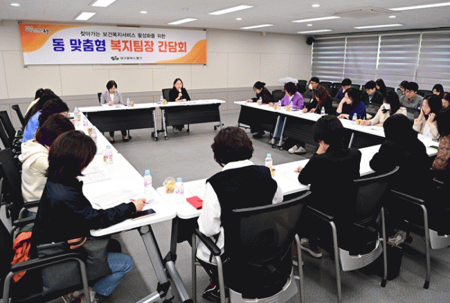 [NWS¹æ¼Û=Çѽ¸ñ ±âÀÚ]´ë±¸ µ¿±¸Ã»Àº Áö³­ 10ÀÏ, µ¿±¸Ã» 3Ãþ ¼ÒȸÀǽǿ¡¼­ µ¿ ã¾Æ°¡´Â º¸°Çº¹Áö¼­ºñ½º Ȱ¼ºÈ­¸¦ À§ÇØ 2025³â »ó¹Ý±â µ¿ ¸ÂÃãÇü º¹ÁöÆÀÀå °£´ãȸ¸¦ °³ÃÖÇß´Ù. À̹ø °£´ãȸ¿¡´Â ±¸Ã» Èñ¸Áº¹ÁöÆÀ°ú 22°³ µ¿ ¸ÂÃãÇü º¹ÁöÆÀÀ塦