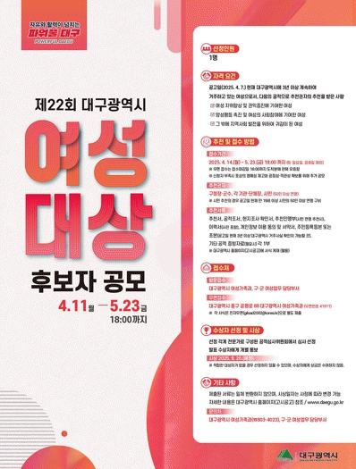 [NWS¹æ¼Û=Çѽ¸ñ ±âÀÚ]´ë±¸±¤¿ª½Ã´Â ¿©¼ºÀÇ ÁöÀ§Çâ»ó°ú ¾ç¼ºÆòµî»çȸ ±¸ÇöÀ» À§ÇØ °øÇåÇÑ ¿©¼ºÀ» ¹ß±¼Çϱâ À§ÇØ 4¿ù 14ÀϺÎÅÍ 5¿ù 23ÀϱîÁö ¡®Á¦22ȸ ´ë±¸±¤¿ª½Ã ¿©¼º´ë»ó¡¯ ¼ö»óÈĺ¸ÀÚ¸¦ °ø°³ ¸ðÁýÇÑ´Ù. ¼ö»ó ÀÚ°ÝÀº °ø°íÀÏ ÇöÀç ´ë±¸±¤¡¦