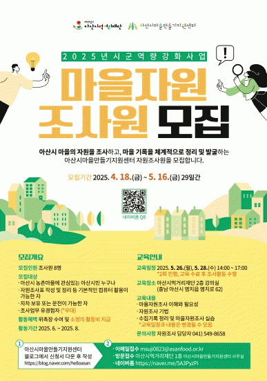 [NWS¹æ¼Û=Çѽ¸ñ ±âÀÚ]Ãæ³² ¾Æ»ê½Ã¸Ô°Å¸®Àç´ÜÀº ¿À´Â 4¿ù 18ÀϺÎÅÍ 5¿ù 16ÀϱîÁö ¸¶À»ÀÚ¿øÁ¶»ç Á¶»ç¿ø ¸ðÁýÀ» ½Ç½ÃÇÑ´Ù. '2025³â ÀÚ¿øÁ¶»ç'´Â ¸¶À»¿¡ »êÀçµÇ¾î ÀÖ´Â À¯?¹«ÇüÀÇ ÀÚ¿øÀ» Á¶»çÇϰí Á¤È®ÇÑ ¸¶À» ºÐ¼®À» ÅëÇØ ÀڷḦ ÃëÇÕÇϸ硦