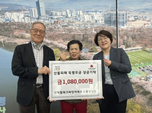 [NWS¹æ¼Û=Çѽ¸ñ ±âÀÚ]¾çÆò±º ¾çÆòÀ¾Àº ¼¾Æ®·²ÆÄÅ© ½á¹Ô¾ÆÆÄÆ® °æ·Î´ç ȸ¿øµéÀÌ 10ÀÏ ¿µ³² »êºÒ ÇÇÇØ Áö¿ªÀ» µ½±â À§ÇØ ¼º±Ý 108¸¸ ¿øÀ» °æ±â»çȸº¹Áö°øµ¿¸ð±Ýȸ¿¡ ±âŹÇß´Ù°í ¹àÇû´Ù. Àü´ÞµÈ ¼º±ÝÀº »êºÒ ÇÇÇØ Áö¿ªÀÇ º¹±¸¿Í ÀÌÀç¹Î Áö¡¦