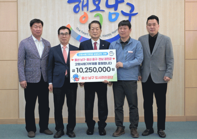 [NWS¹æ¼Û=Çѽ¸ñ ±âÀÚ] ¿ï»ê³²±¸µµ½Ã°ü¸®°ø´ÜÀº 11ÀÏ ³²±¸Ã»¿¡¼­ °íÇâ»ç¶û±âºÎÁ¦ Àü´Þ½ÄÀ» ÁøÇàÇß´Ù. À̹ø Àü´Þ½Ä¿¡¼­´Â ³²±¸µµ½Ã°ü¸®°ø´Ü ÀÓÁ÷¿ø 114¸íÀÌ ÀÚ¹ßÀûÀ¸·Î ¸ðÀº 1,250¸¸ ¿øÀÌ Àü´ÞµÆ´Ù. ¿ï»ê ³²±¸ ¿Ü ÁÖ¼Ò¸¦ µÐ ÀÓÁ÷¿ø¡¦