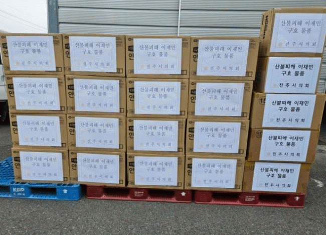 [NWS¹æ¼Û=Çѽ¸ñ ±âÀÚ] ÀüÁÖ½ÃÀÇȸ´Â ÃÖ±Ù ´ëÇü »êºÒ·Î ¸·´ëÇÑ ÇÇÇØ¸¦ ÀÔÀº Àڸŵµ½Ã °æºÏ ¾Èµ¿ÀÇ ÀÌÀç¹ÎµéÀ» µ½±â À§ÇØ ±ä±Þ ±¸È£¹°Ç°À» Àü´ÞÇß´Ù°í 11ÀÏ ¹àÇû´Ù. ½ÃÀÇȸ´Â ÃÖ±Ù »êºÒ ÇÇÇØ¿¡ µû¶ó ¼Ò¼Ó ÀÇ¿ø°ú »ç¹«±¹ Á÷¿øÀ» ´ë»óÀ¸·Î¡¦