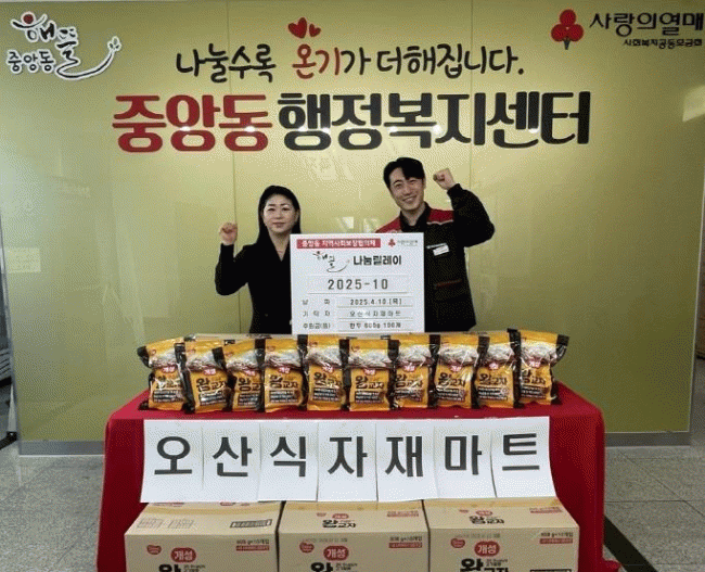 [NWS¹æ¼Û=Çѽ¸ñ ±âÀÚ]¿À»ê½Ã Áß¾Óµ¿ÇàÁ¤º¹Áö¼¾ÅÍ´Â Áö³­ 10ÀÏ, ¿À»ê ½ÄÀÚÀ縶Ʈ(´ëÇ¥ ½ÅÁ¾Çö)°¡ ³Ãµ¿¸¸µÎ 100Æ÷¸¦ ±âºÎÇϸç, 2025³â Áß¾Óµ¿¡®Çض㳪´®¸±·¹ÀÌ Á¦10È£¡¯ÁÖÀÚ·Î Âü¿©Çß´Ù°í ¹àÇû´Ù. À̹ø¿¡ ±âŹµÈ ¹°Ç°Àº Áß¾Óµ¿ ³» º¹Áö ¡¦