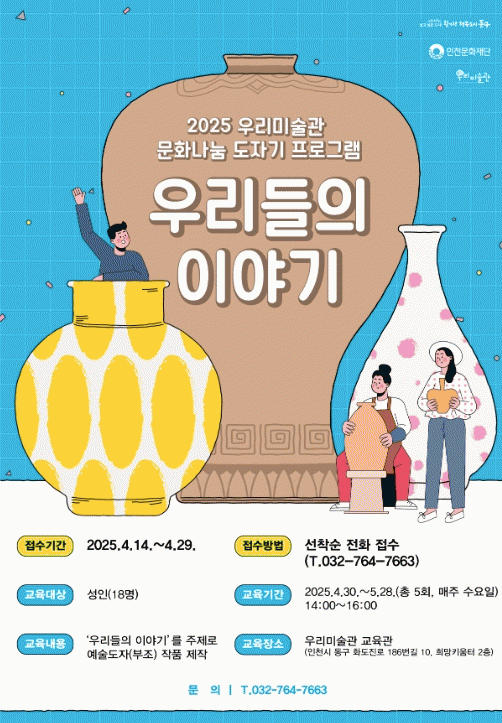 [NWS¹æ¼Û=Çѽ¸ñ ±âÀÚ]ÀÎõ µ¿±¸ ¿ì¸®¹Ì¼ú°üÀº '¿ì¸®µéÀÇ À̾߱â'¸¦ ÁÖÁ¦·Î ¹®È­³ª´® µµÀÚ±â ÇÁ·Î±×·¥ Âü¿©ÀÚ¸¦ ¸ðÁýÇÑ´Ù°í ¹àÇû´Ù. ÇÁ·Î±×·¥Àº 4¿ù 30ÀÏ~5¿ù 28ÀϱîÁö ¿ì¸®¹Ì¼ú°ü ±³À°°ü¿¡¼­ ¸ÅÁÖ ¼ö¿äÀÏ ÃÑ5ȸ ÁøÇàµÇ¸ç, µ¿±¸¿¡ °ÅÁÖ¡¦