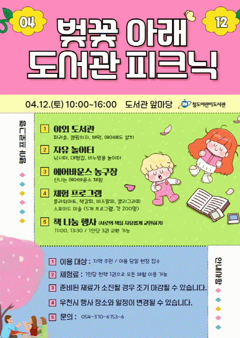 [NWS¹æ¼Û=Çѽ¸ñ ±âÀÚ] ûµµ±º(±º¼ö ±èÇϼö)Àº ¿À´Â 4¿ù 12ÀÏ Åä¿äÀÏ ¿ÀÀü 10½ÃºÎÅÍ ¿ÀÈÄ 4½Ã±îÁö ûµµ¾î¸°À̵µ¼­°ü ¾Õ¸¶´ç¿¡¼­ ¾ß¿Ü µµ¼­°ü üÇè Çà»çÀÎ'º¢²É ¾Æ·¡ µµ¼­°ü ÇÇÅ©´Ð'À» °³ÃÖÇÑ´Ù. À̹ø Çà»ç´Â'µµ¼­°ü¹ý ½ÃÇà·É'Á¦31Á¶¿¡ ¡¦