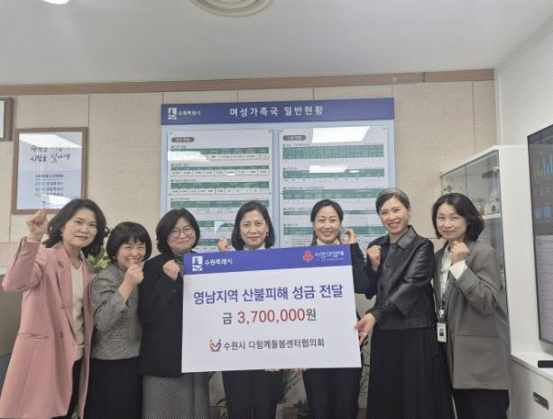 [NWS¹æ¼Û=Çѽ¸ñ ±âÀÚ]¼ö¿ø½Ã ´ÙÇÔ²²µ¹º½¼¾ÅÍÇùÀÇȸ°¡ ¡°»êºÒ ÇÇÇØ º¹±¸¿¡ »ç¿ëÇØ ´Þ¶ó¡±¸ç ´ÙÇÔ²²µ¹º½¼¾ÅÍ Á¾»çÀÚ 47¸íÀÌ ¸ðÀº ¼º±Ý 370¸¸ ¿øÀ» ¼ö¿ø½Ã¿¡ Àü´ÞÇß´Ù. ¼º±ÝÀº °æ±âµµ »çȸº¹Áö°øµ¿¸ð±Ýȸ ¡®2025³â ¿µ³² Áö¿ª »êºÒÇÇÇØ Áö¿ø¡¦