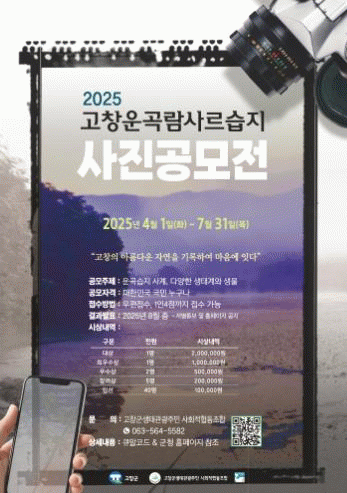 [NWS¹æ¼Û=Çѽ¸ñ ±âÀÚ]°íⱺ°ú °íⱺ»ýŰü±¤ÁֹλçȸÀûÇùµ¿Á¶ÇÕÀÌ ¡®2025³â °íâ¿î°î¶÷»ç¸£½ÀÁö »çÁø°ø¸ðÀü¡¯À» ¿À´Â 7¿ù±îÁö °³ÃÖÇÑ´Ù. °ø¸ðÀüÀº ¡®°íâÀÇ ÀÚ¿¬À» ±â·ÏÇÏ°í ¸¶À½¿¡ Àմ´١¯´Â ÁÖÁ¦·Î, ¿î°î¶÷»ç¸£½ÀÁöÀÇ »ýÅÂÀû °¡Ä¡¡¦