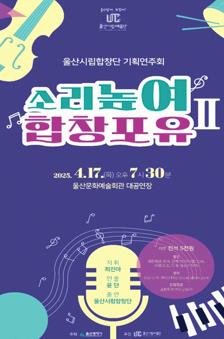 [NWS¹æ¼Û=Çѽ¸ñ ±âÀÚ] ¿ï»ê½Ã¸³ÇÕâ´ÜÀÌ ¿À´Â 4¿ù 17ÀÏ ¿ÀÈÄ 7½Ã 30ºÐ ¿ï»ê¹®È­¿¹¼úȸ°ü ´ë°ø¿¬Àå¿¡¼­ ¡®¼Ò¸®³ô¿© ÇÕâÆ÷À¯ ¥±¡¯¸¦ ¼±º¸ÀδÙ. À̹ø °ø¿¬Àº ½Ã¸³ÇÕâ´Ü ÃÖÁø¾Æ ºÎÁöÈÖÀÚ°¡ ÁöÈÖºÀÀ» Àâ°í ¹ÂÁöÄÃ, ÆË, °¡¿ä µî ´ëÁßÀûÀΡ¦