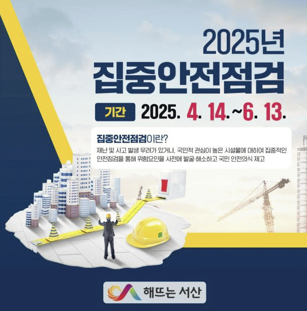 [NWS¹æ¼Û=Çѽ¸ñ ±âÀÚ]Ãæ³² ¼­»ê½Ã´Â 4¿ù 14ÀϺÎÅÍ 6¿ù 13ÀϱîÁö ¹Î°£ Àü¹®°¡¿Í ÇÔ²² 2025³â ÁýÁß¾ÈÀüÁ¡°Ë¿¡ ³ª¼±´Ù°í ¹àÇû´Ù. À̹ø Á¡°ËÀº Àç³­ À§Çè ¿ä¼Ò¸¦ ¼±Á¦ÀûÀ¸·Î ¹ß±¼Çϰí ÇØ¼ÒÇØ ½Ã¹ÎÀÇ ¾ÈÀüÀ» È®º¸Çϱâ À§ÇØ ÁøÇàµÈ´Ù. Á¡°Ë ¡¦