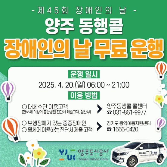 [NWS¹æ¼Û=Çѽ¸ñ ±âÀÚ]¾çÁÖµµ½Ã°ø»ç´Â ¡®Á¦45ȸ Àå¾ÖÀÎÀÇ ³¯¡¯À» ¸Â¾Æ 4¿ù 20ÀÏ ÇÏ·ç µ¿¾È ±³Åë¾àÀÚÀ̵¿Áö¿ø Â÷·®(¾çÁÖ µ¿ÇàÄÝ)À» ¹«·á·Î ¿îÇàÇÑ´Ù°í ¹àÇû´Ù. À̹ø ¹«·á ¿îÇàÀº ±³Åë¾àÀÚÀÇ À̵¿±Ç º¸Àå ¹× »çȸÀû °¡Ä¡ ½ÇÇöÀ» À§ÇØ ¸¶·Ã¡¦