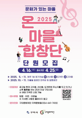 [NWS¹æ¼Û=Çѽ¸ñ ±âÀÚ]±¸¹Ì¹®È­Àç´ÜÀº ±¸¹Ì½Ã¹Î¿¡°Ô À½¾ÇÀ» ÅëÇÑ »îÀÇ È°·ÂÀ» ¼±»çÇϰíÀÚ 2025³â'¿Â¸¶À» ÇÕâ´Ü'À» â´ÜÇÏ°í ´Ü¿øÀ» ¸ðÁýÇÑ´Ù. ¼±¹ßµÈ ´Ü¿øÀº ¸ÅÁÖ 1ȸ Àü¹® ÁöÈÖÀÚ°¡ ÁöµµÇÏ´Â Á¤±â ¿¬½ÀÀ» ÅëÇØ À½¾ÇÀû ±â·®À» ¿¬¸¶ÇÒ ¡¦