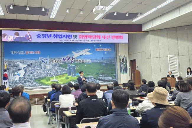 [NWS¹æ¼Û=Çѽ¸ñ ±âÀÚ]´ë±¸ ´Þ¼­±¸°¡ 8ÀÏ ±¸Ã» 2Ãþ ´ë°­´ç¿¡¼­ ÁßÀå³â ±¸Á÷ÀÚ 73¸íÀÌ Âü¼®ÇÑ °¡¿îµ¥ '2025 ÁßÀå³â Ãë¾÷¹Ú¶÷ȸ »çÀü¼³¸íȸ'¸¦ °³ÃÖÇß´Ù. À̹ø »çÀü ¼³¸íȸ´Â 40´ë ÀÌ»ó ±¸Á÷ÀÚµéÀ» ´ë»óÀ¸·Î Ãֽаí¿ë µ¿Çâ°ú ½ÇÁúÀûÀÎ ±¸¡¦