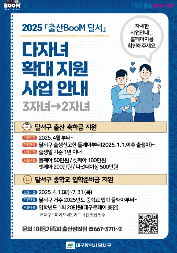 [NWS¹æ¼Û=Çѽ¸ñ ±âÀÚ]´ë±¸ ´Þ¼­±¸´Â ÃÊÀúÃâ»ê À§±âÀÇ Àü·«Àû ´ëÀÀÀ» À§ÇÑ 'Ãâ»êBooM ´Þ¼­' ÇÁ·ÎÁ§Æ® ÀÏȯÀÎ ´ÙÀÚ³à Áö¿ø»ç¾÷À» ´ëÆø È®´ëÇÏ¿©, Ãâ»êÃàÇϱݰú ÁßÇлý ÀÔÇÐÁغñ±Ý Áö¿ø ´ë»óÀ» 4¿ùºÎÅÍ µÑ°¾Æ·Î È®´ë ½ÃÇàÇÑ´Ù. À̹ø Áö¿ø¡¦