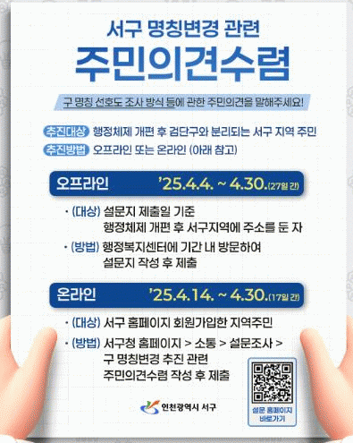 [NWS¹æ¼Û=Çѽ¸ñ ±âÀÚ] ÀÎõ ¼­±¸´Â ÀÌ´Þ 30ÀϱîÁö ±¸ ¸íĪº¯°æ ÁÖ¹ÎÀǰ߼ö·Å ±â°£À» ¿¬ÀåÇϰí, ¿Â¶óÀÎ ¼³¹®Á¶»ç ⱸµµ Ãß°¡ °³¼³ÇÑ´Ù°í 10ÀÏ ¹àÇû´Ù. ÁÖ¹ÎÀǰ߼ö·ÅÀº ÇàÁ¤Ã¼Á¦ °³Æí ÈÄ °Ë´Ü±¸¿Í ºÐ¸®µÇ´Â ¼­±¸ Áö¿ª ÁÖ¹ÎÀº ´©±¸³ª µ¿¡¦