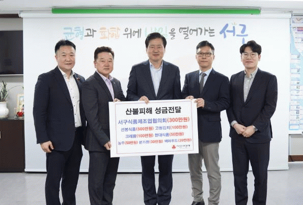 [NWS¹æ¼Û=Çѽ¸ñ ±âÀÚ]ÀÎõ±¤¿ª½Ã ¼­±¸´Â Áö³­ 9ÀÏ ¿µ³²Áö¿ª¿¡¼­ ¹ß»ýÇÑ »êºÒ ÇÇÇØÁö¿ªÀ» µ½±â À§ÇÏ¿© ¼­±¸½ÄǰÁ¦Á¶¾÷ÇùÀÇȸ(ȸÀå ÀÓº´¼®)·ÎºÎÅÍ ¼º±Ý 1,210¸¸¿ø Àü´Þ¹Þ¾Ò´Ù. ¼º±Ý ±âºÎ´Â ¡ã¼­±¸½ÄǰÁ¦Á¶¾÷ÇùÀÇȸ 300¸¸¿ø ¡ã¼±ºÀ½Äǰ 5¡¦