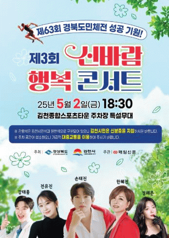 [NWS¹æ¼Û=Çѽ¸ñ ±âÀÚ] ±èõ½Ã´Â Á¦63ȸ °æºÏµµ¹ÎüÀü ¼º°ø ¹× ÃàÁ¦ ºÐÀ§±â Á¶¼ºÀ» À§ÇÑ 'Á¦3ȸ ½Å¹Ù¶÷ Çູ Äܼ­Æ®'¸¦ 2025³â 5¿ù 2ÀÏ 18½Ã30ºÐ ±èõÁ¾ÇÕ½ºÆ÷Ã÷Ÿ¿î ÁÖÂ÷Àå Æ¯¼³¹«´ë¿¡¼­ °³ÃÖÇÑ´Ù°í ¹àÇû´Ù. À̹ø Äܼ­Æ®´Â °¡¼ö ¡®¼ÕÅ¡¦