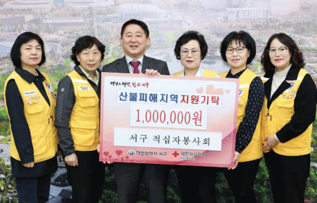 [NWS¹æ¼Û=Çѽ¸ñ ±âÀÚ]´ëÀü ¼­±¸´Â Áö³­ 8ÀÏ Àû½ÊÀÚºÀ»çȸ°¡ ´ë±Ô¸ð »êºÒ ÇÇÇØ º¹±¸¸¦ Áö¿øÇϱâ À§ÇØ ÀÚÀ²ÀûÀ¸·Î ¸ð±ÝÇÑ ¼º±Ý 100¸¸ ¿øÀ» Àü´Þ¹Þ¾Ò´Ù°í ¹àÇû´Ù. À̹ø ¼º±ÝÀº ¿ï»êÀ» ºñ·ÔÇÑ °æºÏ¡¤°æ³² Áö¿ª¿¡¼­ ¹ß»ýÇÑ »êºÒ·Î ÇÇÇØ¸¦ º»¡¦