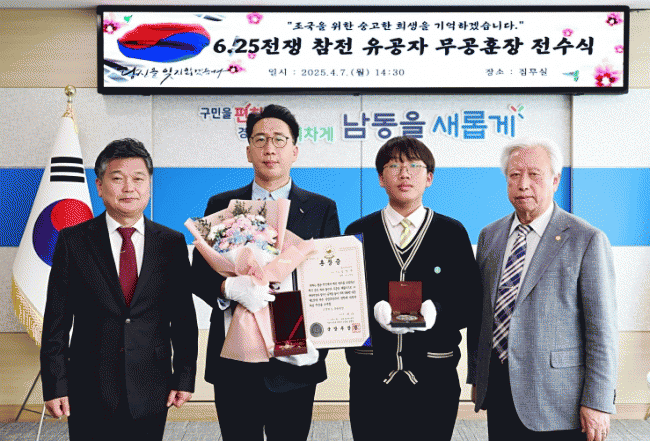 [NWS¹æ¼Û=Çѽ¸ñ ±âÀÚ]ÀÎõ½Ã ³²µ¿±¸´Â 6¡¤25 ÀüÀï ±ÝÈ­Áö±¸ ÀüÅõ¿¡ ÂüÀüÇØ °øÀ» ¼¼¿î °í(ͺ) ±èâȯ ´ëÀ§ÀÇ À¯Á·¿¡°Ô È­¶û¹«°øÈÆÀåÀ» Àü¼öÇß´Ù°í 10ÀÏ ¹àÇû´Ù. Àü¼ö½Ä¿¡´Â °íÀÎÀÇ ¼ÕÀÚÀÎ ±èÅÂÈ£ ¾¾°¡ ¾Æµé°ú ÇÔ²² Âü¼®ÇØ À¯°¡Á· ´ëÇ¥·Î¡¦