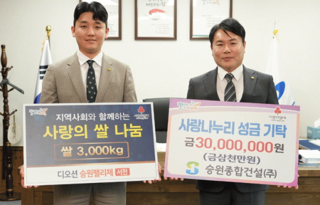 [NWS¹æ¼Û=Çѽ¸ñ ±âÀÚ]½Â¿øÁ¾ÇհǼ³Àº Áö³­ 7ÀÏ Áö¿ª»çȸÀÇ ¾î·Á¿î ÀÌ¿ôÀ» µ½±â À§ÇÑ ÀÌ¿ô»ç¶û ½ÇõÀÇ ÀÏȯÀ¸·Î ¼º±Ý 3õ¸¸¿ø°ú ¹é¹Ì 3000kgÀ» ¼­Ãµ±º¿¡ ÁöÁ¤ ±âŹÇß´Ù. À̹ø ±âŹÀº ¡®½Â¿øÆÓ¸®Ã¼ ¼­Ãµ¡¯ ¸ðµ¨ÇϿ콺 ¿ÀǽÄÀ» ÃàÇÏÇÏ¸ç ¡¦