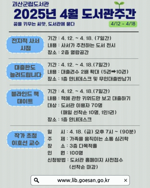 [NWS¹æ¼Û=Çѽ¸ñ ±âÀÚ]ÃæºÏ ±«»ê±º¸³µµ¼­°üÀº °³°ü ÀÌÈÄ Ã³À½ ¸Â´Â ¡®µµ¼­°üÀÇ ³¯¡¯(4¿ù 12ÀÏ)À» ±â³äÇØ ¿À´Â 12ÀϺÎÅÍ 18ÀϱîÁö ¡®µµ¼­°ü ÁÖ°£ Çà»ç¡¯¸¦ ¿î¿µÇÑ´Ù°í ¹àÇû´Ù. ¿ÃÇØ µµ¼­°ü ÁÖ°£ÀÇ ÁÖÁ¦´Â ¡®²ÞÀ» Ű¿ì´Â ¾¾¾Ñ, µµ¼­°ü¿¡ ¹¯¡¦