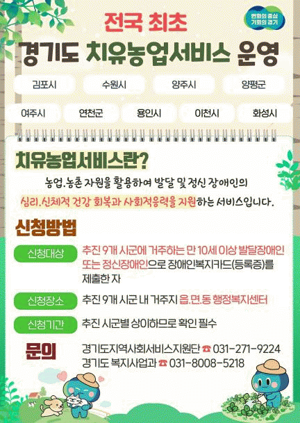[NWS¹æ¼Û=Çѽ¸ñ ±âÀÚ]°æ±âµµ´Â ¹ß´Þ¡¤Á¤½ÅÀå¾ÖÀÎÀ» ´ë»óÀ¸·Î ÇÏ´Â ¡®Ä¡À¯³ó¾÷¼­ºñ½º¡¯¸¦ ±âÁ¸ 6°³ ½Ã±º¿¡¼­ ¿ÃÇØ 9°³ ½Ã±ºÀ¸·Î È®´ë ¿î¿µÇÑ´Ù°í 10ÀÏ ¹àÇû´Ù. µµ´Â Áö¿ª»çȸ¼­ºñ½º ÅõÀÚ»ç¾÷ÀÇ Çϳª·Î Áö³­ 2023³âºÎÅÍ ³ó¾÷°ú º¹Áö¸¦ ¿¬¡¦