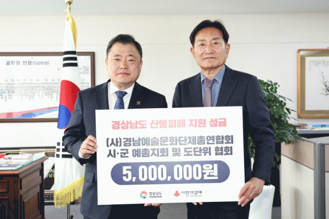 [NWS¹æ¼Û=Çѽ¸ñ ±âÀÚ]°æ»ó³²µµ´Â 9ÀÏ Á¶º¸Çö °æ³²¿¹ÃÑ È¸Àå, ¹Îâȫ °æ»ó³²µµ¹®ÀÎÇùȸÀå°ú ±è¼ø¾Ö °æ³²¿¹ÃÑ ¸¶»êÁöȸÀåÀÌ °æ³²µµÃ»À» ¹æ¹®ÇØ ¹Ú¸í±Õ ÇàÁ¤ºÎÁö»ç¿¡°Ô ¼º±Ý 500¸¸ ¿øÀ» Á÷Á¢ Àü´ÞÇß´Ù°í ¹àÇû´Ù. À̹ø ¼º±ÝÀº °æ³²¿¹ÃÑ, ¿¹¡¦