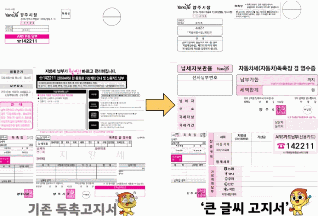 [NWS¹æ¼Û=Çѽ¸ñ ±âÀÚ]¾çÁֽð¡ À̹ø 4¿ù ¹ß¼ÛµÈ ÀÚµ¿Â÷¼¼ µ¶Ã˺кÎÅÍ ½Ã¹ÎµéÀÌ ´õ¿í ½±°Ô Áö¹æ¼¼ °íÁö¼­¸¦ È®ÀÎÇϰí ÀÌÇØÇÒ ¼ö ÀÖµµ·Ï ¡®Å« ±Û¾¾ Áö¹æ¼¼ °íÁö¼­¡¯¸¦ »õ·Ó°Ô µµÀÔÇß´Ù°í ¹àÇû´Ù. ±âÁ¸ÀÇ Áö¹æ¼¼ °íÁö¼­´Â ±ÛÀÚ°¡ ÀÛ°í Á¤¡¦