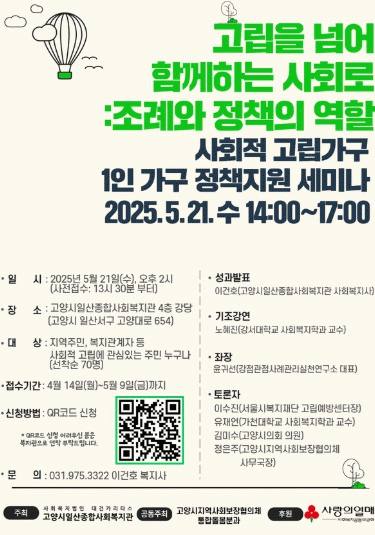 [NWS¹æ¼Û=Çѽ¸ñ ±âÀÚ]°í¾ç½ÃÀÏ»êÁ¾ÇÕ»çȸº¹Áö°üÀº ¿À´Â 5¿ù 21ÀÏ ¿ÀÈÄ 2½Ã, º¹Áö°ü 4Ãþ °­´ç¿¡¼­ ¡®°í¸³À» ³Ñ¾î ÇÔ²²ÇÏ´Â »çȸ·Î: Á¶·Ê¿Í Á¤Ã¥ÀÇ ¿ªÇÒ¡¯À» ÁÖÁ¦·Î ¡®2025³â »çȸÀû °í¸³°¡±¸ 1ÀÎ °¡±¸ Á¤Ã¥Áö¿ø ¼¼¹Ì³ª¡¯¸¦ °³ÃÖÇÑ´Ù. ÀÌ¡¦